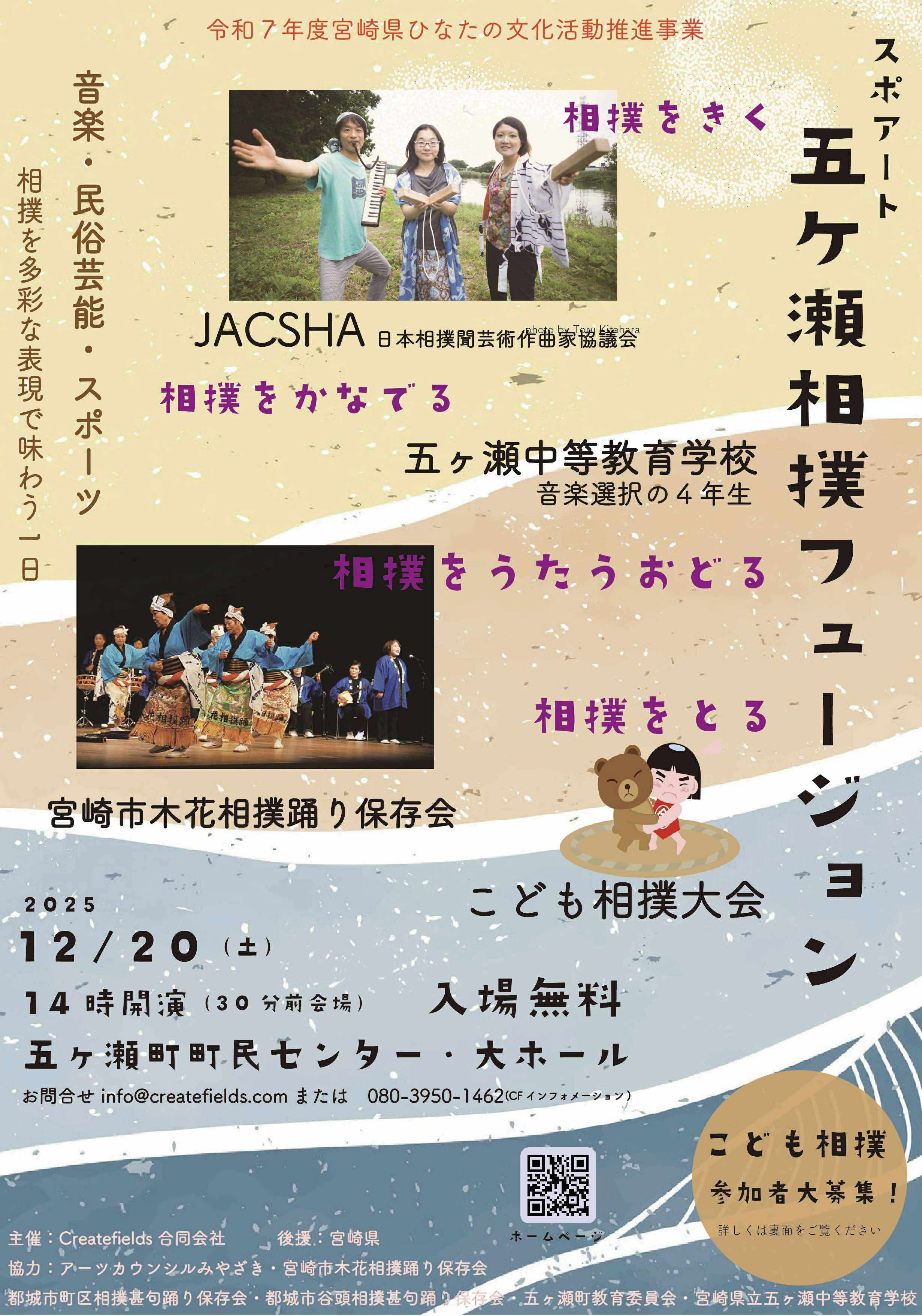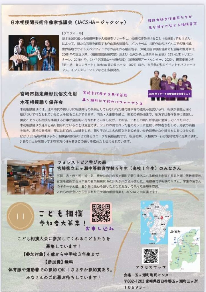 宮崎県五ヶ瀬町でのイベント「スポアート 五ヶ瀬相撲フュージョン」に出演します。宮崎市の木花相撲踊り、五ヶ瀬中等教育学校、こども相撲大会とのコラボです。木花相撲踊り保存会さんとは、昨年8月に初めてお会いし、五ヶ瀬中等教育学校4年生音楽選択の生徒さんたちとは、本番に向けて11月から何度かワークショップを重ねています。こども相撲大会の出場者も募集中です!!是非是非遊びに来てください。五ヶ瀬は自然がダイナミックで豊かでとってもいいところです!