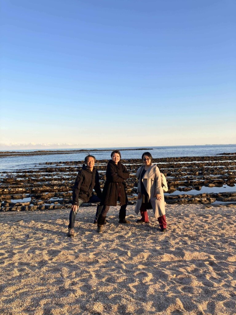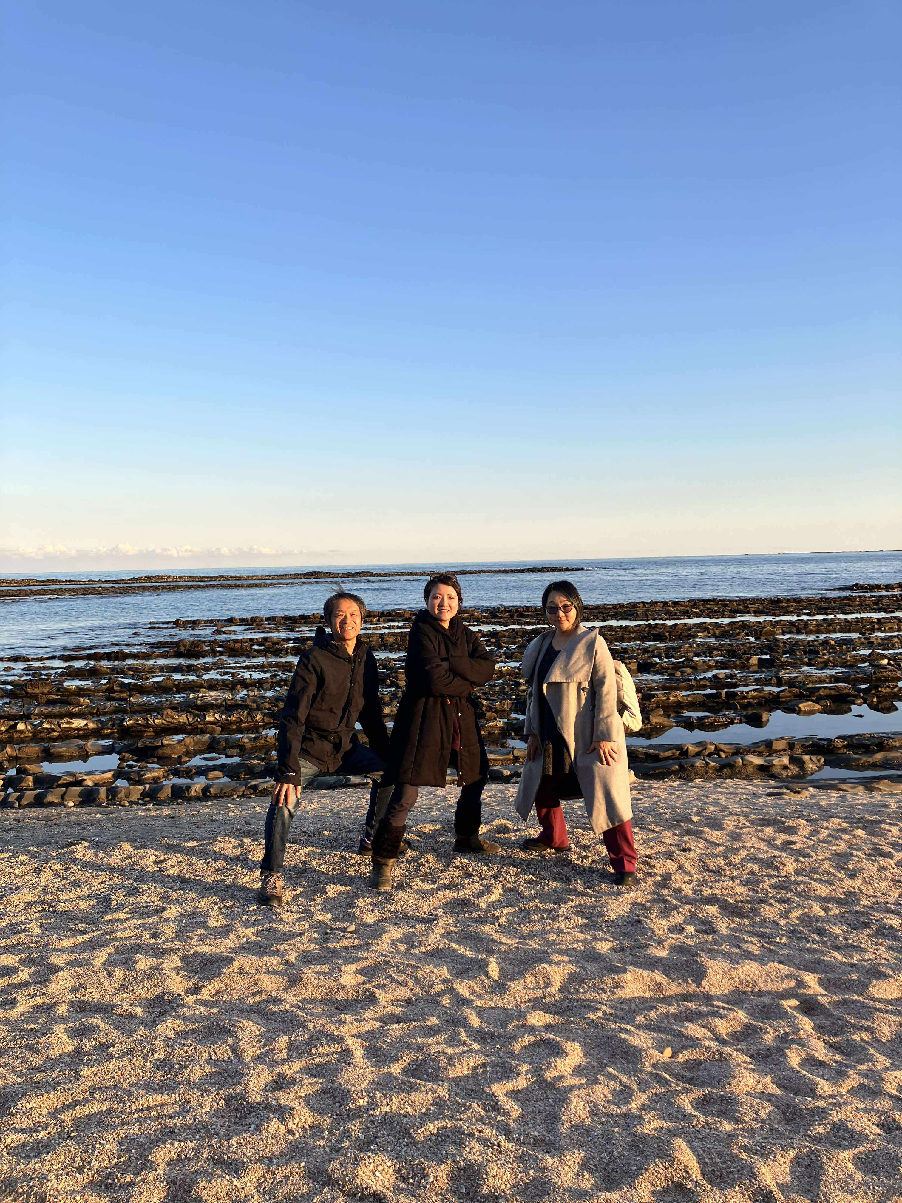 青島の鬼の洗濯板をバックに、JACSHA野村、鶴見、樅山