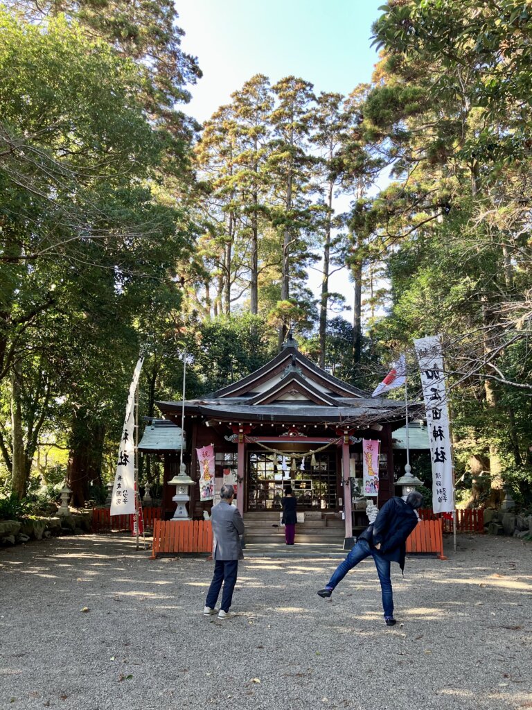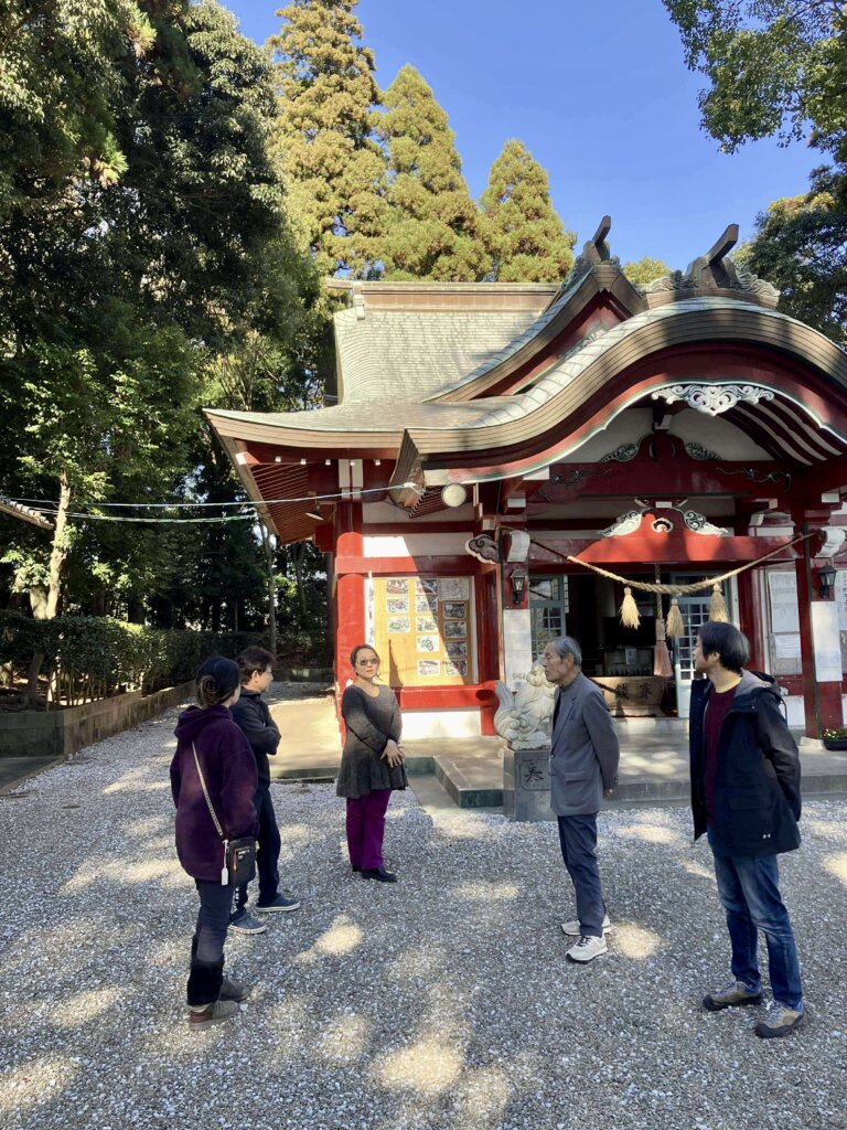 打ち合わせ後は、木花相撲踊り保存会代表の河野さんが、木花相撲踊りに縁のある近所の神社、熊野神社、加江田神社、木花神社を案内くださり、木花の神様達にご挨拶をすることができました。熊野神社では、宮司の田代さんから、木花相撲踊りは春祭り、夏祭り、秋祭りで奉納されることをお話してくださいました。その後は、青島神社にも参詣しました。青島の砂浜には、笛としてよく鳴るフジツボがたくさんあったので、音を出しながら散策をしたり、鬼の洗濯板と呼ばれる、自然にできた海岸の形状にも圧倒され、宮崎の大自然も満喫することができました。